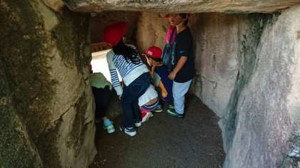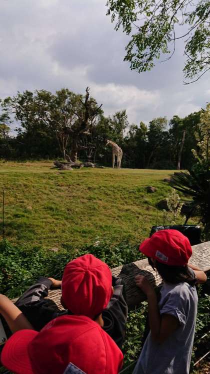 木立を抜けたり、洞窟のようなところの説明ボードを覗いたりと子どもたちの行動範囲も広がります!やっぱキリンは大きいね!