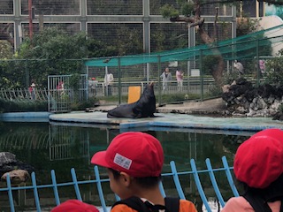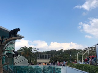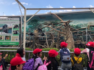チンパンジーが最後の動物との出会いでした!なんと「桜のみんな!さようなら」とでも言ってくれているようなチンパンジーの姿でした!あんな高い所で怖くないのかな?と心配する優しい子どもたちです!このあとは学校に戻ります!最後まで気を緩めずに帰ります!