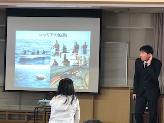「船はいくらでできますか?」と子どもたちの質問タイム?なんと全てできるのに250億だそうです!「海賊は?」「船長さんは何してるの?」「年収は?」「きれいな海は?」「馬力は?」「どんな人が働いてますか?」「世界で一番大きな船は?」「一番大変なことは?」「津波が来たらどうしますか?」子どもたちの質問は止まりません!海賊の写真には食いつく子どもたちでした!