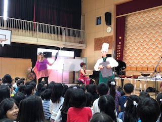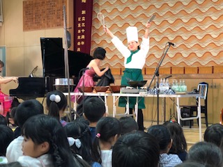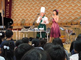 お料理作ったことある?ある!と元気な子どもたち!料理人!チンゲンサイ先生の登場です!コックさんの先生に子どもたちは大興奮!料理器具を楽器に変身させて音を奏でます!ビンが奏でる音に子どもたちは興味津々!
