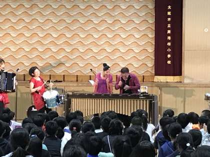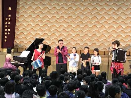 誰か大人の人?あっ!6年生の多田先生が前に登場しました!そして、マリンバとピアノとマラカスと立て続けに楽器を演奏しました!子どもたちも大喜び!先生も満面の笑顔で子どもたちに答えます!大人が楽しくする姿は子どもたちを楽しくします!大人が元気なら子どもたちも元気になります!大人がどんなふうに生きているのかを子どもは見ています!誠実な大人!嘘のない大人!自分から動く大人!そんな大人から子どもは学び、大人も子どもから学びます!いつも明るく元気で前向きな大人であり続けましょう!