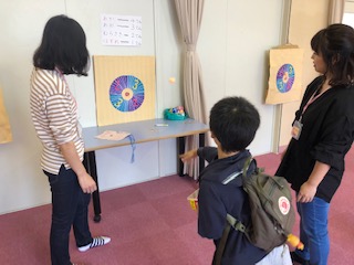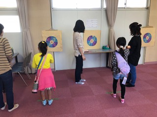 あか、あお、むらさき、はずれ、それぞれに点数が入ります!簡単そうでこれもなかなか難しい!でもちょっと難しいほうがちょうどいい!子どもたちは10点越えを狙います!