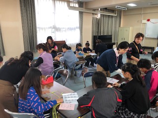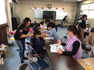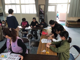 事前申し込みの子どもたちがミサンガに挑戦しています!細かい作業に大人が寄り添って支えます!ほのぼのした光景でした!