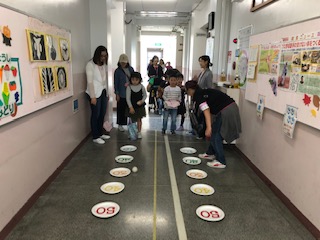紙皿の高得点めがけて、赤白玉を投げ入れます!平面に近い紙皿の上に止めるのが難しい!小さな子どもたちにもやりやすくて、みんなが楽しんでいました!