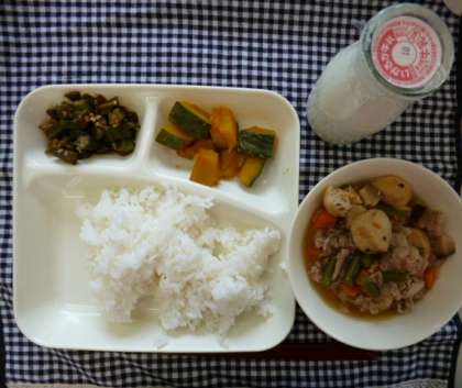 7月に入り、給食には夏野菜がたくさん登場しています。きょうの給食は、「豚肉と一口がんもの煮物、かぼちゃのしょうゆ焼き、オクラのおかかいため」でしたが、子どもたちは、夏野菜のかぼちゃやオクラをおいしくしっかり食べていました。