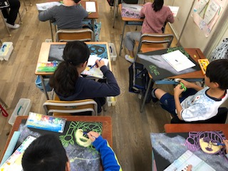 作品展まで、あと12日!子どもたちは自分らしく作品づくりに取り組んでいます!マヨネーズより少しゆるめの色をつくります!ゆるめとは、薄めのこと!表現って難しいですね!でもこれも大人の発想で子どもたちはその感覚を持って、色づくりを楽しんでいます!やっぱり子どもって素敵です!