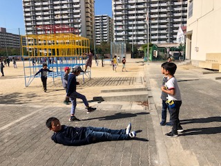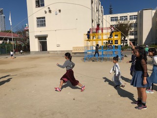 15分の中休み!子どもたちは運動場に飛び出します!今日はポカポカ陽気の最高のお天気!汗ばむくらいです!中庭にはコスモスが気持ちよく咲き誇っています!その横でコンクリートの上に寝そべる子ども!「めっちゃ!気持ちいい!」と昼寝でもしそうな勢いでくつろいでいました。どの子も伸び伸びと楽しむ姿でした!季節は冬へと向かいます!寒暖差の激しい今こそ、体調管理が大切です!手洗いうがい、教室換気など、自分の身は自分が守る!ですね!