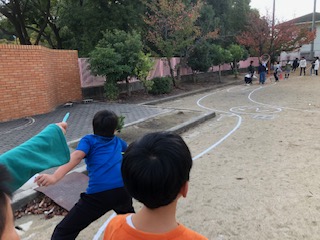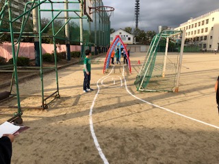 運動場の周辺を使って、フリスビーゴルフにチャレンジしました!簡単そうでこれがなかなか難しい!バンカーもあり、コースアウトするとマイナスポイントありと、工夫されたコースにドキドキ感いっぱい!たかがフリスビー、されどフリスビー!これハマります!