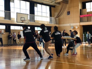 「北中の校長先生の専門教科は?国語?体育」次は二択クイズで棒引きです!答えだと思う方の棒を相手より先に自陣に引き込みます!桜チームは1回戦を2勝1敗で勝利しました!お見事!もう、みんな必死!子どもに戻って楽しむ大人たちです!いいですね!大人の楽しむ姿!