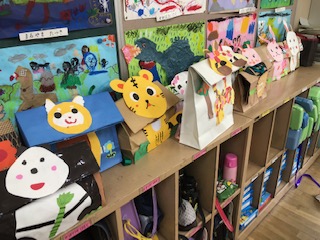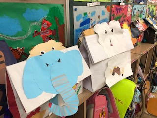 トラ!パンダ!ウサギ!チーター!ライオン!クマ!などなど、子どもたちが自分の好きな動物たちのリュックを紙袋に上手にデザインしてつくりました!写真入りのメッセージボードを添えてとてもうれしそうです!教室に入るやいなや、「見て見て!」と自慢する姿がとても誇らし気で素敵でした!