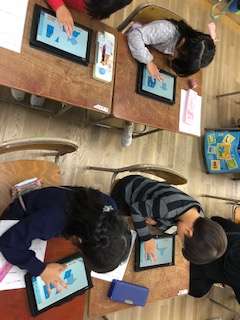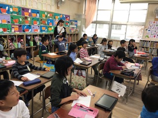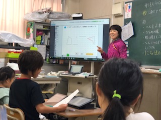 三角形?四角形?どんな特徴があるの?へんを探す!ちょうてんを数える!子どもたちはそれぞれの特徴を自分たちで探します!電子黒板上で形の不思議に気づいた子どもたちは、タブレット端末を使って三角形や四角形づくりをしました!色板パズルのピースの組み合わせは多種多様!いろんな三角形や四角形ができあがります!子どもたちはゲーム感覚でハマってました!