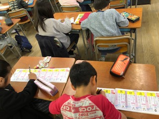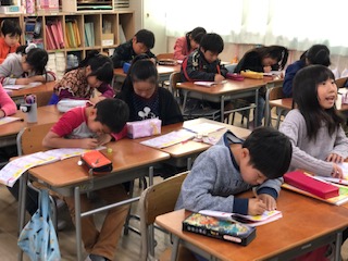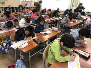 漢字の書き取りに集中する子どもたち!一画一画ていねいに、電子黒板に映し出される筆順から学びます!画数の音声が鳴り響く中、声を合わせて画数を確認しながら学びます!漢字の定着は使い続けること!習った漢字は子どもたちは使いたくてたまりません!お家でもどんどん使うように声をかけてください!