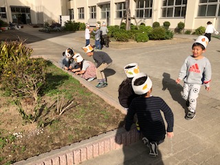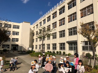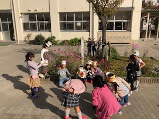秋見つけで見つけた枯葉を画用紙に貼り付けて冠にした子どもたち!みんな笑顔で、これ見て!これいいやろ!と楽しそうでした!見ているだけで、こちらもウキウキ気分でした!子どもたちは中庭から学習園、体育館裏からひょうたん池へと足を伸ばして、実りの秋を楽しみました!