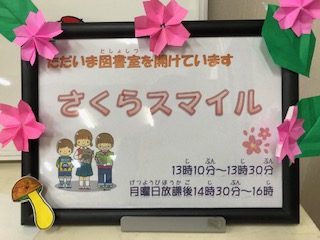 図書館にこんなステキな案内板を見つけました!そう!さくらスマイルの案内です!月曜日の放課後も開館しています!読書の秋です!読書週間です!ぜひみなさんたくさんの本にふれませんか?本っていいですよ!