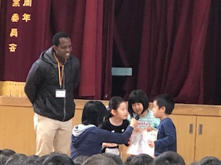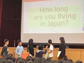 さて、今朝はスペシャルゲスト登場!ジャマイカ出身のパウエルさんです!子どもたちがいろいろ質問します!「好きな食べ物は?好きな色は?好きなスポーツは?日本に来てどれくらい?好きな教科は?」と子どもたちが英語で尋ねます!また、ジャマイカの学校は朝8時から午後2時まで!ランチは持ってきます!ジャマイカの手遊びも教えてもらいました!