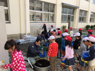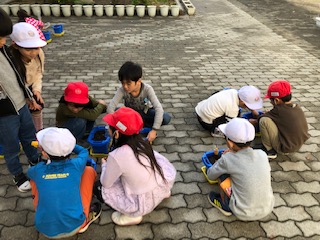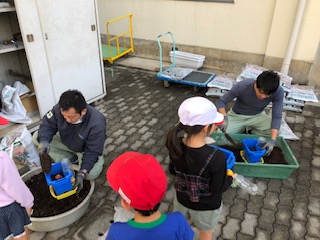 中庭に子どもたちと管理作業員さんとの仲睦まじい光景を目にしました!子どもたちは青いバケツを大事そうに持って、土をもらい、球根を植えました。これから芽が出て、花を咲かせるチューリップの球根たちです!学校は教員だけで成り立ちません!管理作業員さんや給食調理員さん、事務職員さんなど様々な職種の大人がみんなでつくりあげるのがチーム桜です!子どもたちはどんな花が咲くのかウキウキしていました!