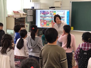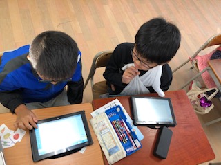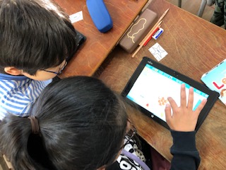 What do you want?と友だちに問いかけ、I want 〜.と自分の好きなフルーツを答えます!さらに、How many 〜?と数を聞き、タブレット端末を使って、自分の大好きなパフェをお互いにつくります!画像を使って、目の前にできあがっていくパフェを楽しみながら、自然と英語を使う子どもたち!相手のことを考えながらの学びは「学び合い」する上で大切なことです!とても明るくて元気な子どもたちの様子が微笑ましく、とっても素敵でした!