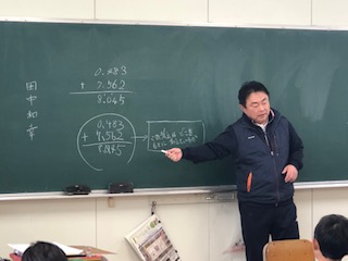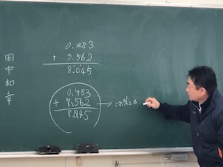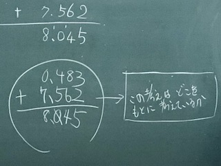 今日の学びは「小数のしくみを調べよう!」です。先生が黒板に問題を書きます。0.483+7.562=?「だれか前に書きに来て?」そして、8.045と書きました。みんなが「いいでーす!」と反応します。田中先生が「他に!違う意見の人?」と聞くと、男の子が0に斜めの線を入れたんです!(写真参照)すると、みんなが「違う!」と声に出しました!そこで間髪入れず先生は、「よし!今日のめあてが決まり!」と言って、黒板にめあてを書きました。「この考えはどこをもとに考えているのか?」と、ここから学び合いが始まるのです!