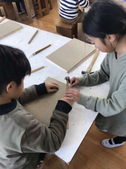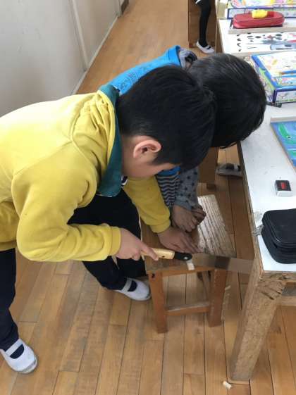 子どもたちは、小さな大工さんになって、のこぎりで木を切ったり、金づちをトントンしたりととても楽しそうでした。なかでも、素敵だったのは、友だち同士で助け合っていたことでした。「ここ押さえてて!」「これ持ってて!」「まっすぐ叩くんやで!」「ゆっくり、ゆっくり、あわてんと!」などなど、互いに声を掛け合って、つくっていきます。学び合ってる子どもの姿がとってもあったかくて、ほっこりしました。怪我しないようにがんばれ!
