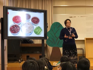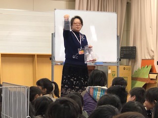中国のことを学ぶ貴重な時間が始まりました。食べ物のこと、伝統芸能のことなど身近な話題に子どもたちは聞き入っていました。特に変面の画像が映ると、子どもたちから歓声が上がりました!民族についてもカラフルな写真を通じて話していただきました。中国語を第2言語にしている人口は2億人!!中国語を母語にしている人口は12億人!!!「中国語を話せると友だちがたくさん増えます!」というのはまさにその通り!他にも食文化の話や食材も現物で見せていただきました。なかでも、一本麺をつくる貴重な映像には驚きました!また、遊びの文化には子どもたちも食い入るように画面を見つめていました。
