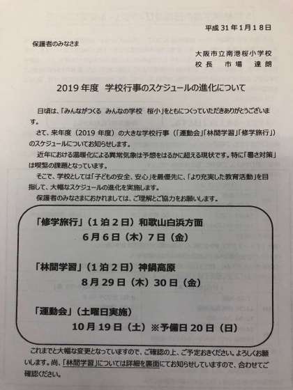 本日上記のお手紙を配布しました。来年度(2019年度)の「運動会」「林間学習」「修学旅行」のスケジュールについてです。