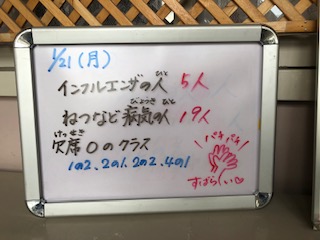 週明けの状況です。先週末に比べると落ち着いています。しかし、油断は禁物です。手洗い、うがい、十分な睡眠と栄養!忘れないでください!