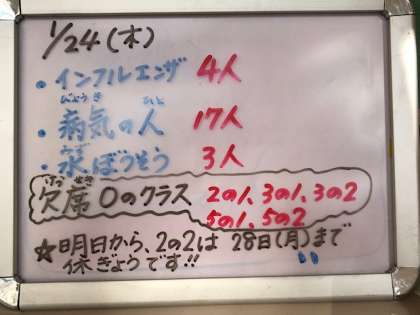 インフルエンザの子どもは少し減りましたが、水ぼうそうの子どもが増えたため、お知らせした通り、2年2組が本日午後から帰宅して、来週の月曜日まで学級休業とします。よろしくお願いします。