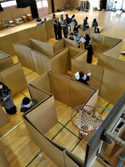 明日のウィンターフェスティバルにはいくつもの楽しいブースが用意されています!なかでも前日から大勢の方々の協力のもと、つくられているのが「ダンボール迷路」です。明日どんな迷路ができているのか楽しみですね!みなさんお疲れ様です。そして、ありがとうございます!