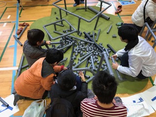 「パイプパズル」実際の工事現場で使用する排水パイプをつかったパズルゲームです。遊びを通じて「水」という資源のことを学んでいます!子どもたちはああでもない!こうでもない!と四苦八苦!その姿が素敵でした!