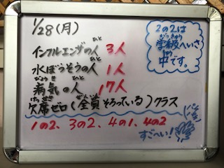 週明けのインフルエンザは落ち着いているようです。学級休業中の2年2組も明日より再開します。すべての子どもも大人も元気でありたいですね。引き続き、うがい、手洗い、十分な睡眠や食事、適度な水分補給を忘れないでください。
