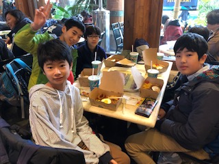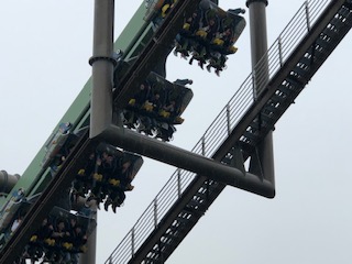 雨の中、食事の席を確保しようと奮闘するグループを発見!別の方に席を譲ったそうで、優しい桜リーダーの姿でした!絶叫マシンも雨中を駆け巡ります!