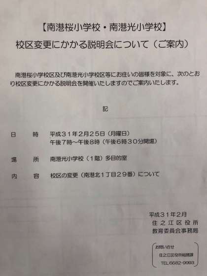 南港北1丁目29番(地下鉄コスモスクエア駅前)で分譲住宅の建設が予定されている用地にかかる校区について、住之江区役所と教育委員会事務局による説明会が開催されます。