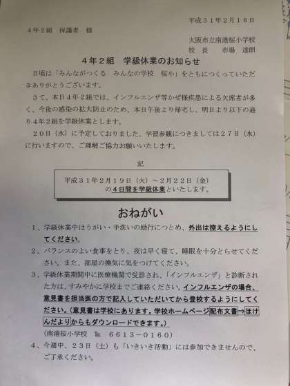 上記の手紙内容の通り、明日より4日間、4年2組が学級休業に入ります。