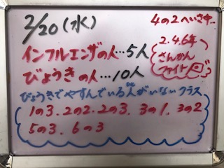 インフルエンザは少しおさまっています。今日は気温が上がってます!花粉が飛びそうですね。手洗い、うがいを忘れずに、健康管理に気をつけましょう!