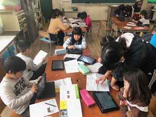 社会科の学習で「昔の道具調べ」で子どもたちはタイムスリップします!タブレットを使って、様々なことを調べています。例えば「ゲーム機の違い」「洗濯機の歴史」「カメラについて」「炊飯器について」などなど、今と昔を比べながら、その違いに気づき、便利さや快適さを見つけることができています。当日の発表をお楽しみに!