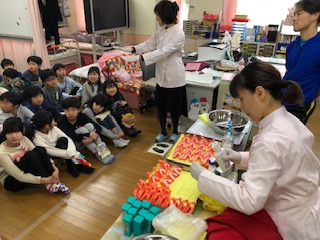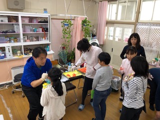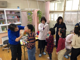保健室に移動して、実際の体験をしました。マウスピースを口にして、しばらく我慢!歯の健康を調べます。少し気持ち悪そうな顔をしていましたが、みんな真剣に作業をしていました。歯の健康は、体全体の健康に繋がります。もし、治療がまだのお子さんがいたら至急お医者さんに行ってくださいね!