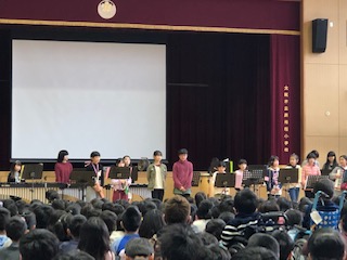 後半はミュージッククラブによる発表ステージです!1曲目は「情熱大陸」打楽器の軽快なリズムに乗せて、音の響きに酔いしれました。2曲目は「千本桜」早いリズムと胸に響くベース音!高度な楽曲を見事に奏でました。3曲目は「アイデア」聞き慣れた曲に子どもたちも思わず心と体がゆさぶられます。みんなの真剣な、一生懸命な姿に勇気と元気をもらいました。とってもいい時間でした!