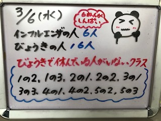2年3組と6年にお休みが多くなっています!自分の身は自分で守りましょう!予防対策を忘れずに!