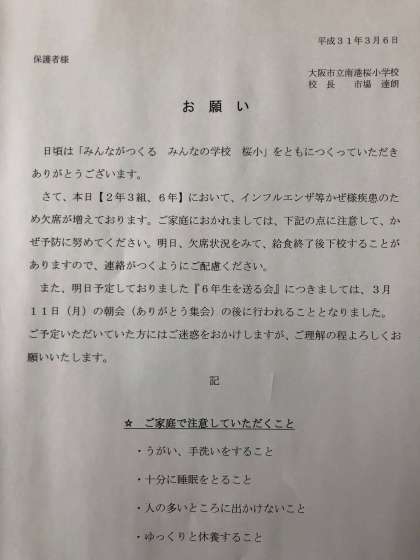 本日配付の手紙の通り、インフルエンザ等かぜ様疾患の欠席者が増えています。該当の学年クラスについては、明日以降の閉鎖措置が取られる可能性がありますので、お心積もりください。また、明日予定の「6年生を送る会」につきましては11日(月)へ延期予定しています。よろしくお願いします。