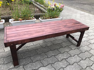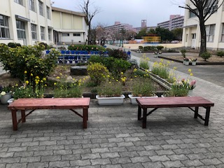 中庭にはこれまでにない数の花々が広がっています。そんな中、ゆっくりと花を愛でるための空間ができました!そう!手作りのベンチです!木のぬくもりを感じることのできるとってもステキな空間ができあがりました!もちろん制作したのは管理作業員さんたちです!二人は想いを実現するプロです!このプロの技には脱帽です!みなさん!ぜひ花鑑賞にお越しください!お待ちしています!