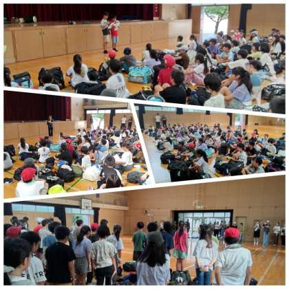 台風の影響で延期になった、5年生の林間学習に行きます。急な予定変更にもご対応いただいた関係者のみなさま、心より感謝いたします。まずは、出発式の様子です。