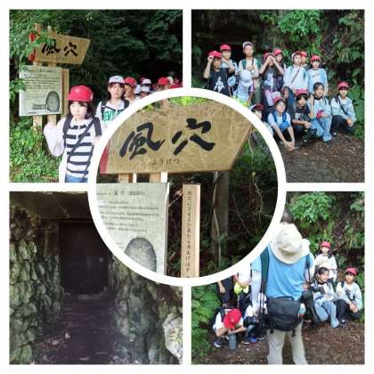 山頂に向かう途中で風穴の見学に寄りました。風穴とは、火山の噴火によって自然にできた空洞で、年間を通して気温が8℃に保たれているそうです。穴のマエに立つと、エアコンの風に当たっている感じがしました。