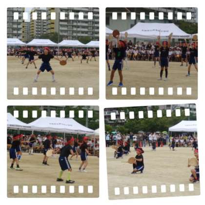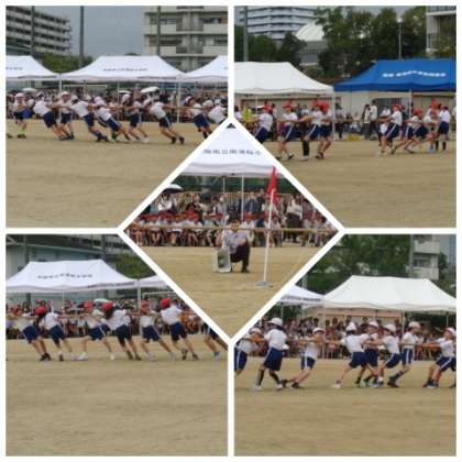 3年生は7番の団体演技「響け!ダイナミック琉球」と13番「引っ張れ!綱引き」に登場しました。演技は沖縄の伝統舞踊であるエイサーをアレンジしたものでした。みんなが打ち付けるパーランクの音が、運動場に響き渡っていました。