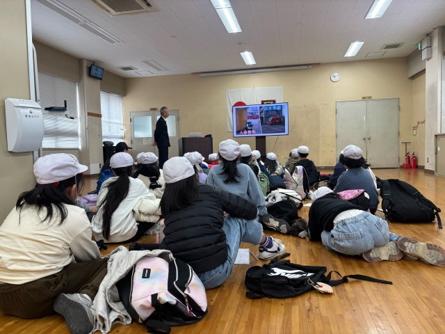 予防担当の方からは、119番通報があってからどのように消防隊の方や、救急隊の方が出動するのか、どのくらいの人数で、どのようにして消火に当たるのかなど、コミカルな演出の資料を見ながら、説明していただきました。
