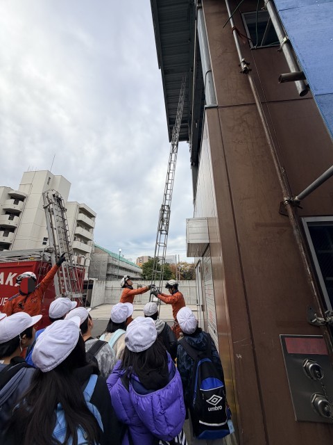 消防署では、クラスごとに分かれ、予防担当の方からの説明と、消防隊の方から器具の説明をそれぞれ交代でしていただきました。