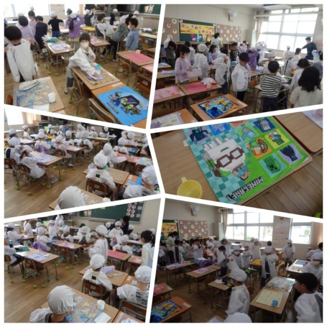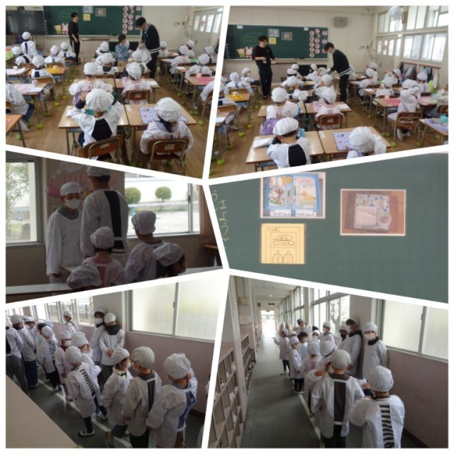 1年生にとって、小学校生活で最初の給食がありました。小学校では給食の準備もみんなで協力をして行います。先生と一緒に給食についてのきまりを確認してから、いよいよお楽しみの給食の時間を迎えます。何もかもが初めてで戸惑うことも多い様子でしたが、子どもたちは白衣に着替えるなどの準備に、楽しそうに取り組んでいました。