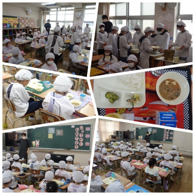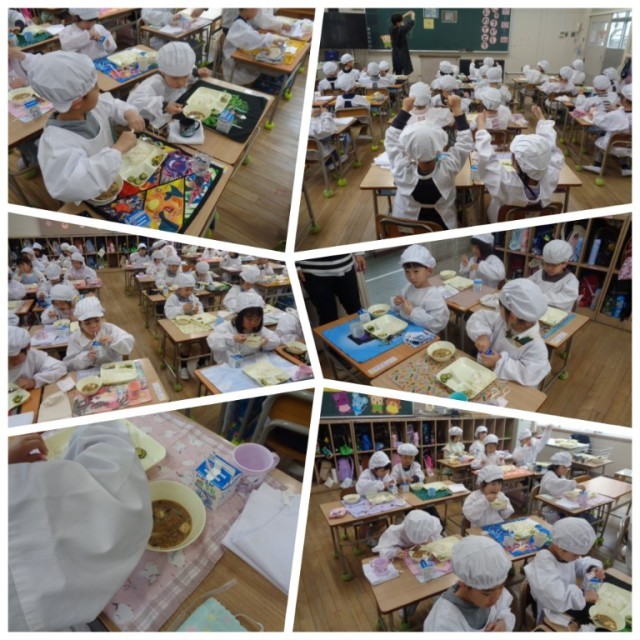 給食の準備も整い、お待ちかねのいただきますです。先生から牛乳パックの開け方や飲み方の指導があり、食事のスタートです。初めての献立は、「マーボ豆腐」「きゅうりの中華あえ」「ツナとちんげんさいのいためもの」「ごはん」「牛乳」でした。きょうしつのあちらこちらから「おいしい」という声が上がっていました。1年生の子どもたちは元気よくたくさん食べていました。