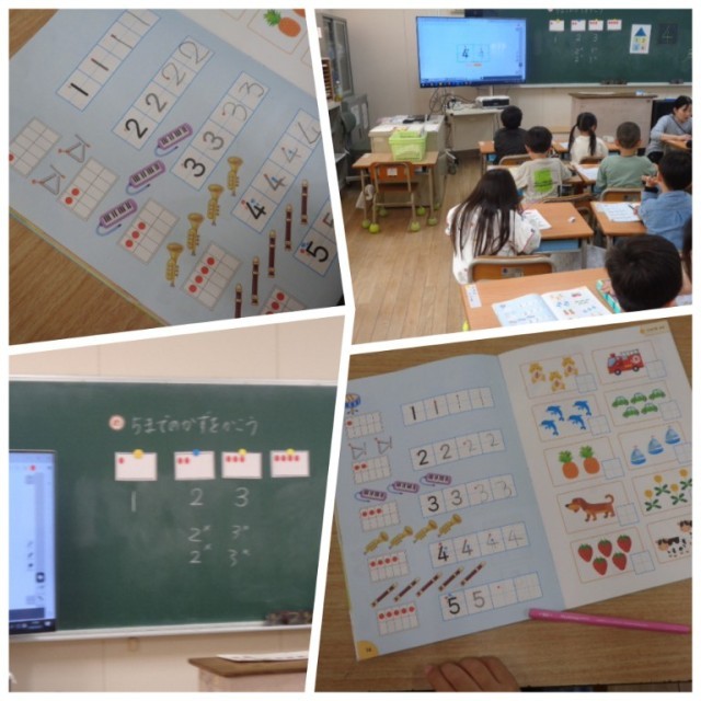 1年生の算数の学習の様子です。1から5までの数字を書く学習に取り組んでいました。一人ひとりが練習帳に数字を丁寧に書き込みながら、注意する部分などを確認していました。