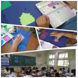 3年生が図工でアジサイの花の絵を描いていました。薄目に溶いた絵の具を指で画用紙...