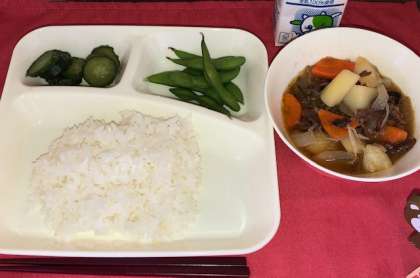 きゅうりの梅風味は塩ゆでしたきゅうりにかつおぶし・梅肉・砂糖・酢・しょうゆをあわせ煮た調味液をかけ、あえています。梅肉の風味がきいてさっぱりした味付けでした。